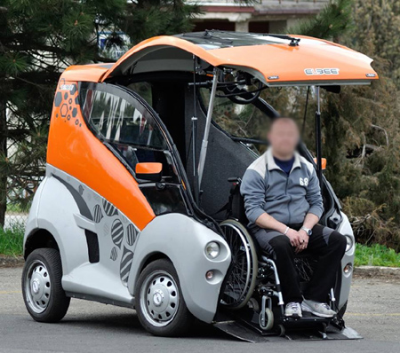 Basé sur un véhicule de production type Daihatsu, on remarquera surtout les "fourches" d'accrochage des fauteuils ainsi que les commandes du tableau de bord.
